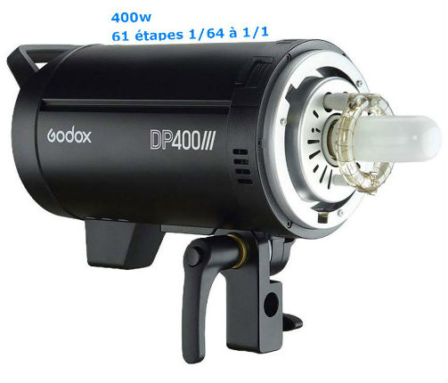 Paiement CB possible en passannt par paypal, pas besoin d'avoir un compte paypal (choisir "Payer sans ouvrir de compte") Le Flash de Studio Godox DP400III est une torche 400Ws avec diverses fonctions professionnelles. Sa température de couleur est de 5600K et son temps de recyclage est seulement de 1 seconde à pleine puissance. Durée de flash réglable de 1 / 800s à 1 / 2000s.